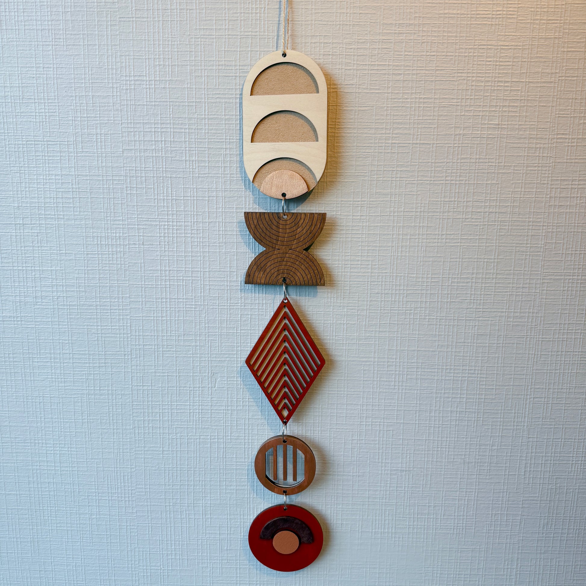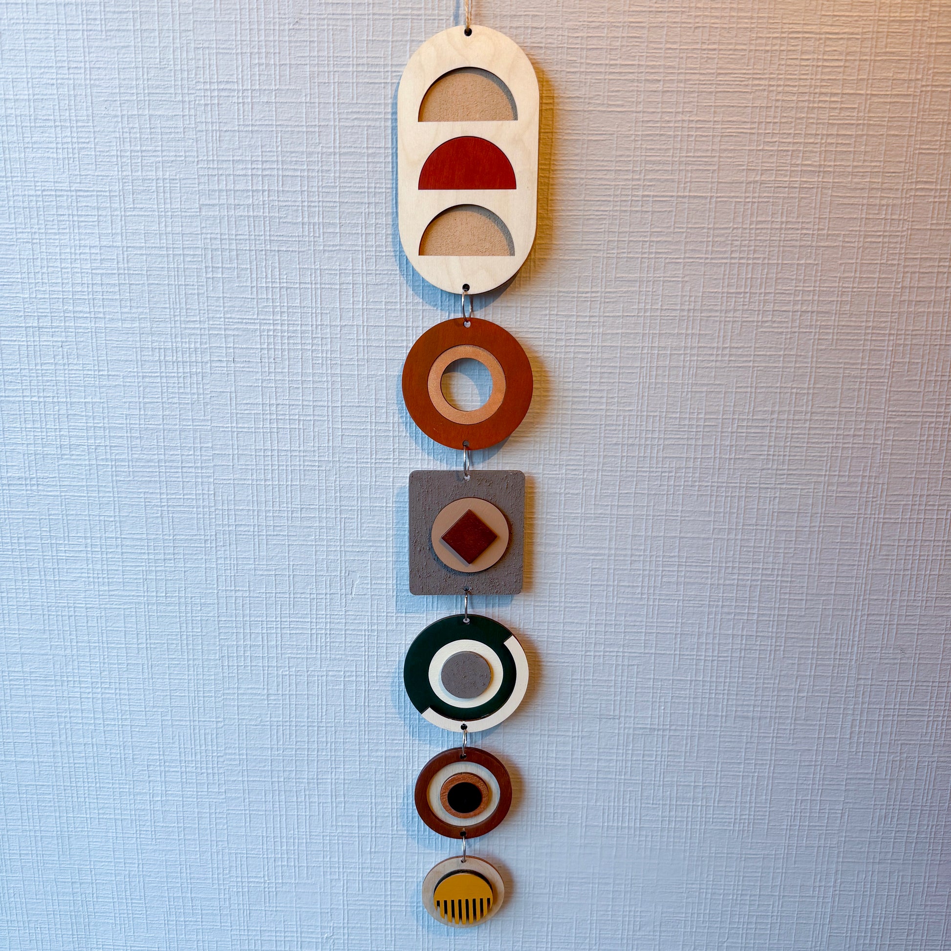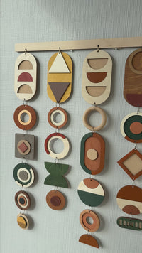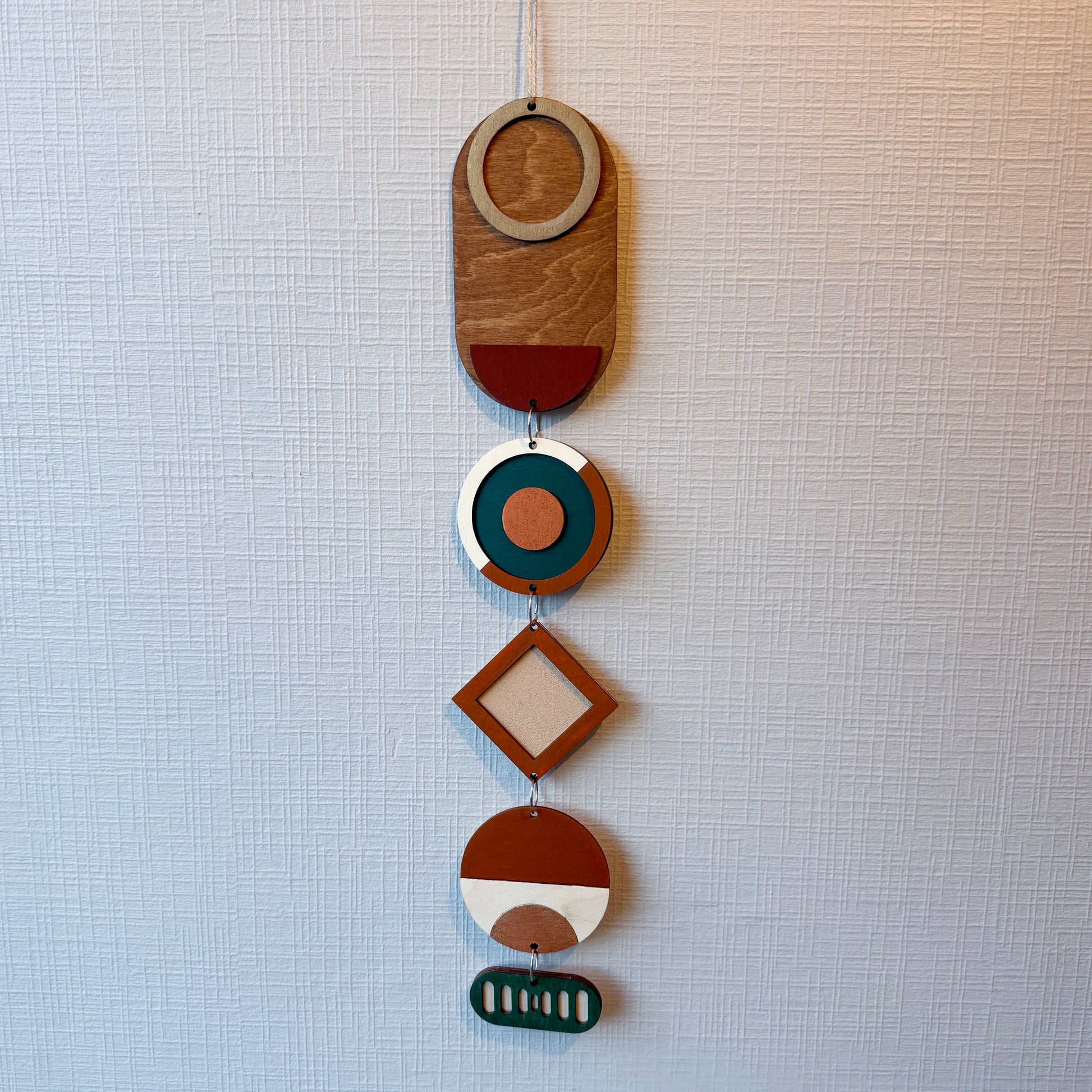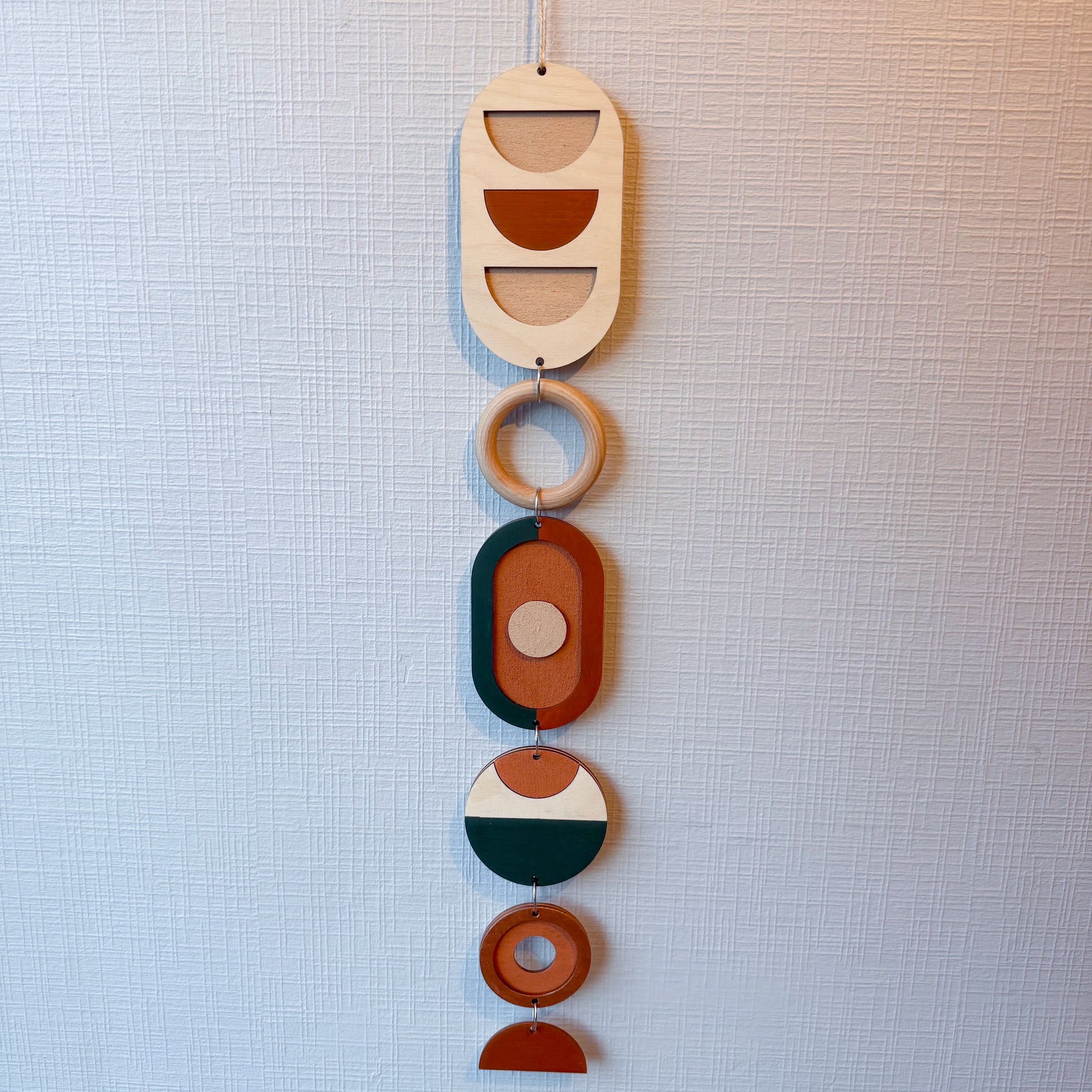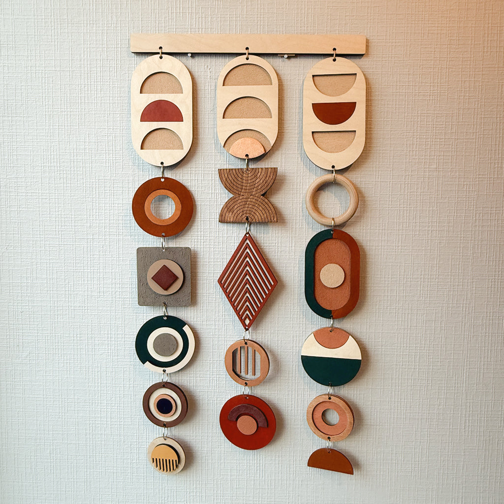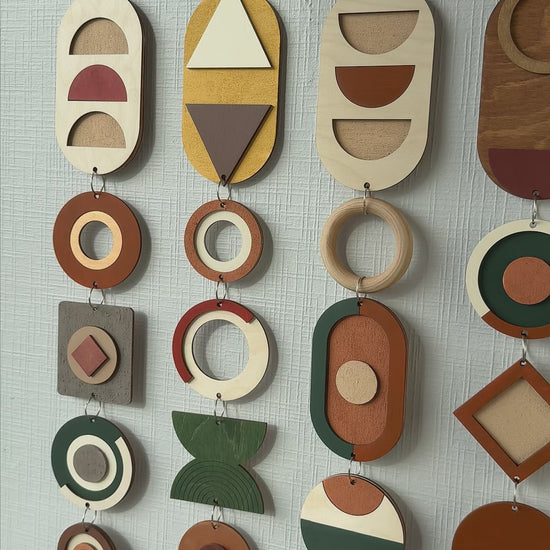 Each element is laser-cut, hand-sanded and hand-painted in earthy tones (terracotta, deep green, warm beige, natural birch) and connected with metal rings for a clean, modern look.